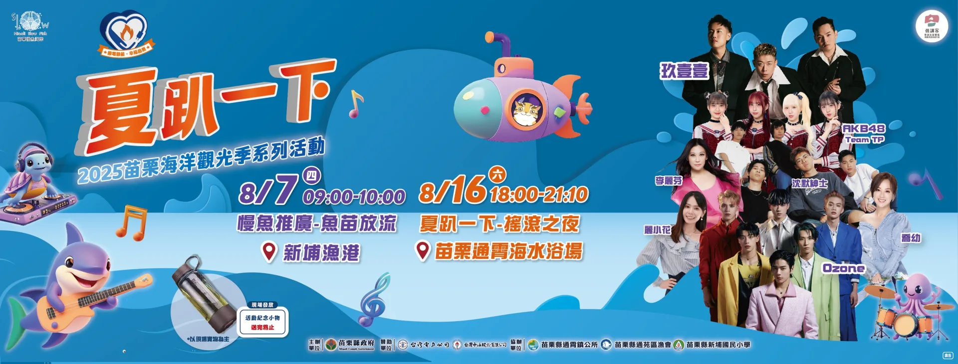 此外,8月16日晚間,通霄海水浴場將舉辦大型晚會,由沈默紳士、喬幼、李麗芬、麗小花、AKB48 Team TP、Ozone、玖壹壹等重量級卡司接力開唱,用音樂傳遞海洋保育、節能減碳與永續生活的理念。現場規劃農漁市集、免費發送紀念小物、有獎徵答等活動,讓遊客體驗道地、熱情的漁村文化。