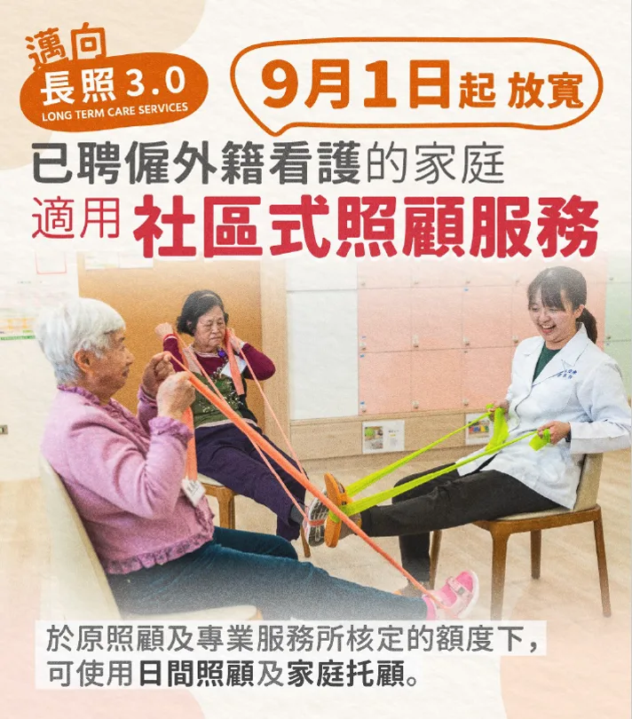 放寬外籍看護家庭服務:家中聘有外籍看護的被照顧者,也可使用日間照顧及家庭托顧等社區式照顧服務,讓外籍看護有更多喘息空間。