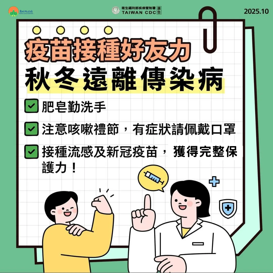 【客庄中心/綜合報導】近期東北季風報到,氣溫變化明顯,預期呼吸道病毒將更活躍,11月1日起開放 50 歲以上無高風險慢性病成人接種流感疫苗及新冠疫苗。呼籲符合公費資格的民眾,儘速接種,可以「左流右新」同時接種,獲得雙重保護力。