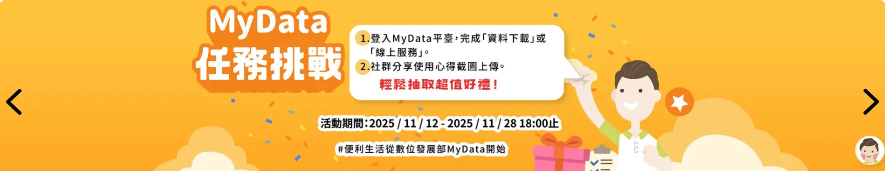 數發部為著推廣服務,對11月12到28號暗晡頭6點,舉辦「MyData 任務挑戰 輕鬆抽取超值好禮」線上活動,鄉親在平台完成資料download還係線上服務過後,分享使用心得到指定社群還過截圖上傳,就有機會抽著禮券。