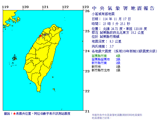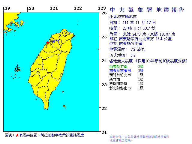 第一起地震發生5分鐘後,昨晚11時5分25秒,在苗栗縣政府北北東方 18.2 公里 、苗栗縣竹南鎮,發生第2起地震,8.3公里,這起地震的最大震度達4級。