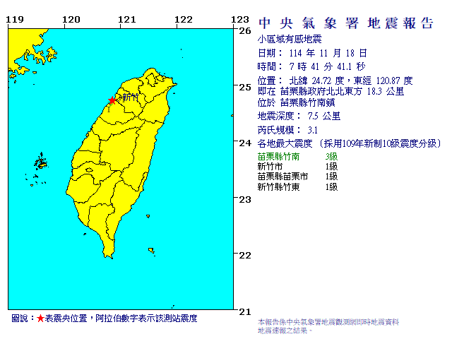 第三起地震發生在今天早上7點41分41秒,震央在苗栗縣政府北北東方18.3公里 、位於苗栗縣竹南鎮,