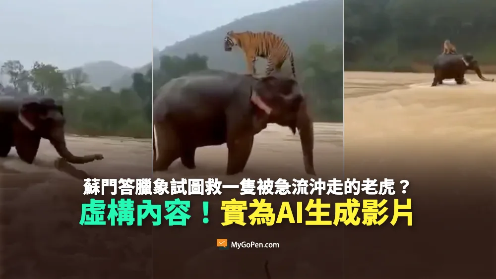 網傳「當印尼蘇門答臘地區遭遇山洪襲擊時,一段罕見而感人的畫面被記錄下來」、「影片中,一隻蘇門答臘象正試圖救起一隻被急流沖走的老虎。」的訊息和影片。經查證,傳言影片經 AI 偵測工具確認,是 AI 生成畫面;該影像至少在 2025 年 12 月 15 日就開始以印度文在網路上流傳,之後又被時常轉傳錯假影像資訊的 X 帳號 Gabriele Corno 以英文發布,現在還出現其他相同敘事的不同版本 AI 影片,為錯誤訊息。