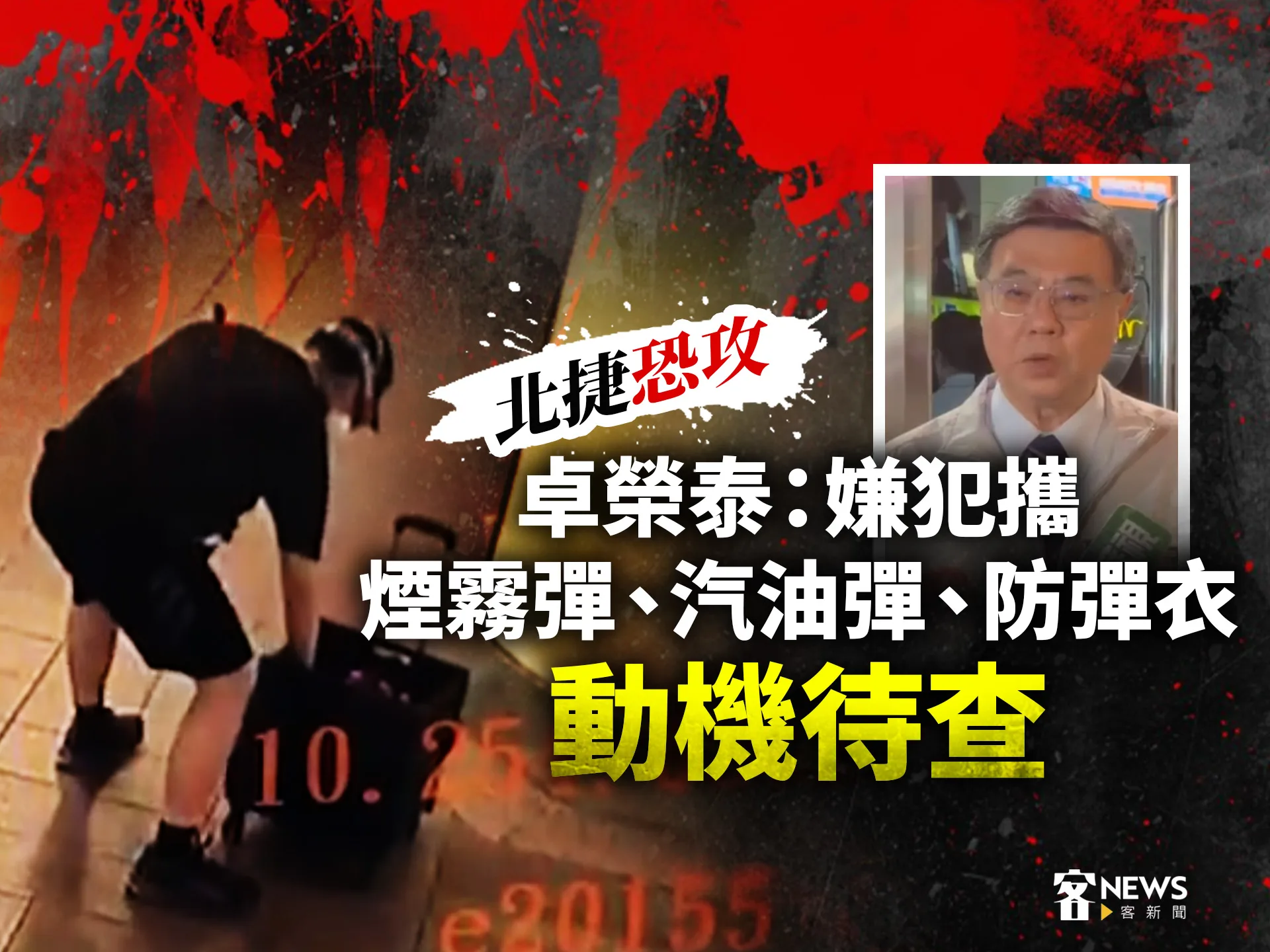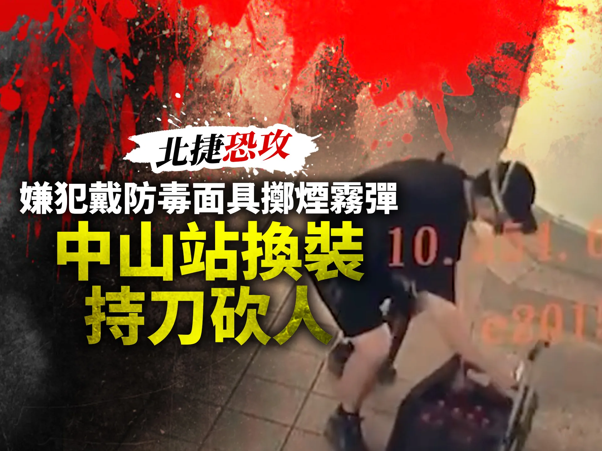 今傍晚台北車站M7、M8出手突然冒出濃煙,由於正值週五下班時間,捷運人潮眾多,濃煙隨即引起民眾挳慌。稍晚,嫌犯轉往捷運中山站,他在南京東路馬路中央投擲煙霧彈後,還戴上護膝、手持一把利器,邊揮砍邊衝進誠品南西店,過程中,民眾驚恐逃竄,有人高呼:「報警!報警!」而嫌犯犯案過程也被民眾拍下。