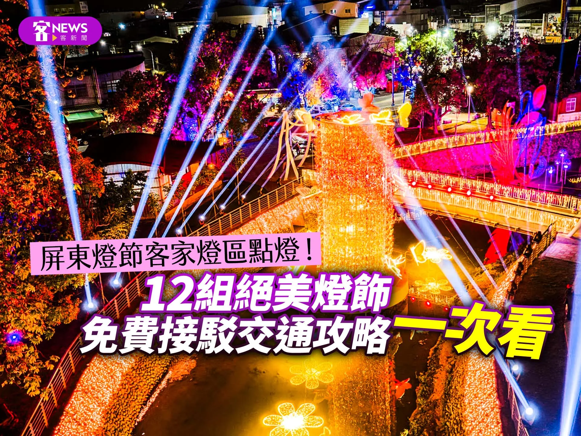 【李台源/綜合報導】屏東燈節四大燈區將在今(23)天晚間正式點燈,位於內埔鄉龍頸溪畔公園的客家燈區,今年以「耀動客家」為主題,總共12組主題燈飾,融入客家竹藝、盤花、剪紙、花布、藍染、粄食及客家獅等文化符碼,在每週六及春節連假,更有客家金曲、親子互動表演、小丑氣球及魔術秀等藝人演出。《客新聞》以下整理2026屏東燈節「客家燈區」12組燈飾以及活動完整資訊。