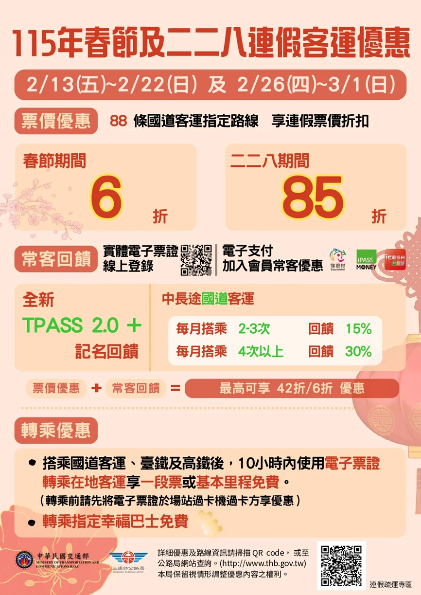 今年春節從2月14日至22日共有9天連假,為減輕連假期間道路壅塞情況,除了台灣高鐵、台鐵加開班次,國道客運日均開行約6500至7000班等方式因應。交通部公路局還推出88條國道客運路線票價6折優惠,再搭配TPASS 2.0+中長途客運優惠方案,春節連假搭乘國道客運票價最佳可達4.2折。