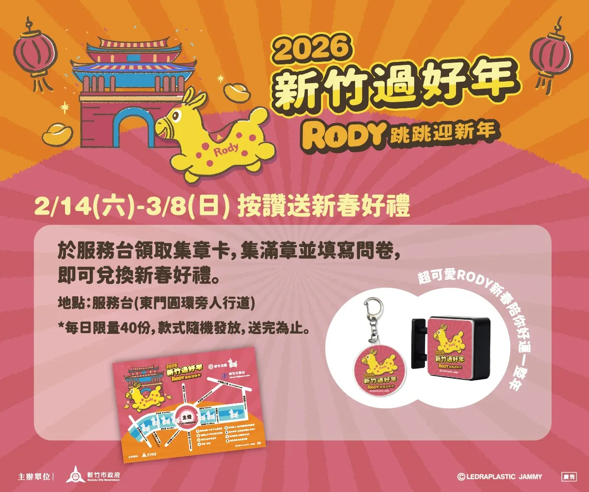 【客庄中心/綜合報導】「2026新竹過好年-RODY跳跳迎新年」將於2月14日晚間在新竹市東門城正式點燈開幕,展開為期23天的燈會活動,開幕當日除了發放限定「小鵲幸×舊振南聯名車輪餅」,因適逢西洋情人節,現場亦設置「情人節RODY打卡牆」洋溢滿滿浪漫氛圍。