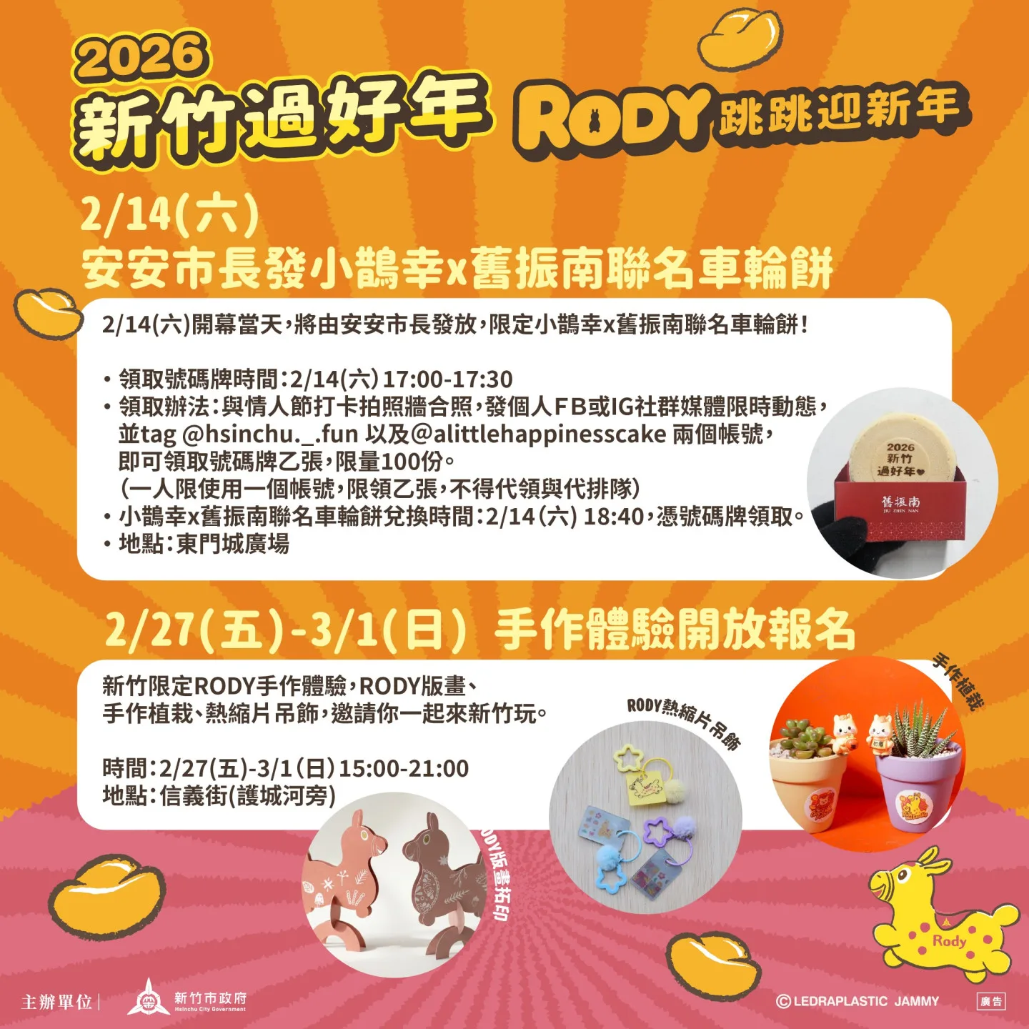 城銷處表示,2月14日點燈開幕當晚,現場將特別準備「2026新竹過好年」限定的「小鵲幸×舊振南聯名車輪餅」,於活動現場免費發放,邀請民眾在賞燈之餘,品嚐甜蜜滋味。因應情人節浪漫氛圍,現場亦設置「情人節RODY打卡牆」,讓情侶、親子與好友與可愛的RODY合影留念,留下專屬的幸福回憶。
