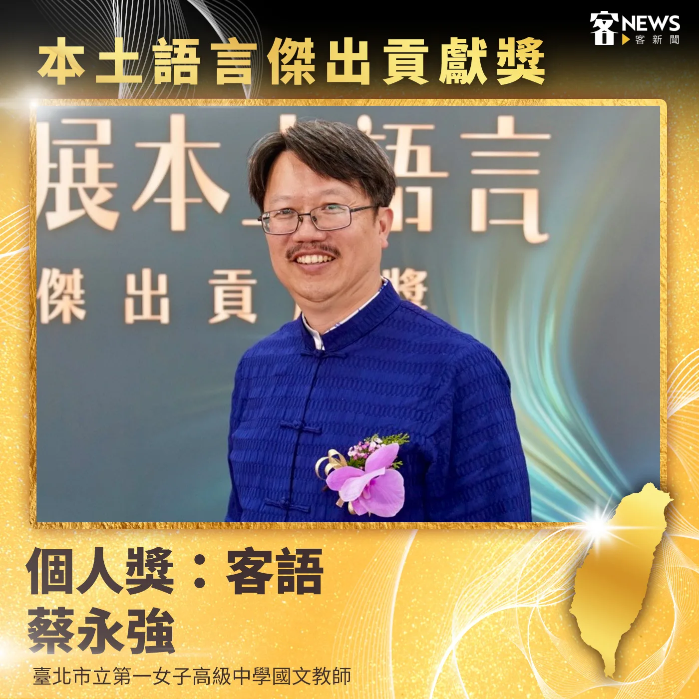 蔡永強教師推動客語融入歷史與戲劇教學,參與課綱與師培制度建構,讓客語成為跨領域學習的教學語言。獲得2026年教育部「本土語言傑出貢獻獎」,肯定其長期投入本土語言教育、研究、創作與社會實踐的卓越成就。