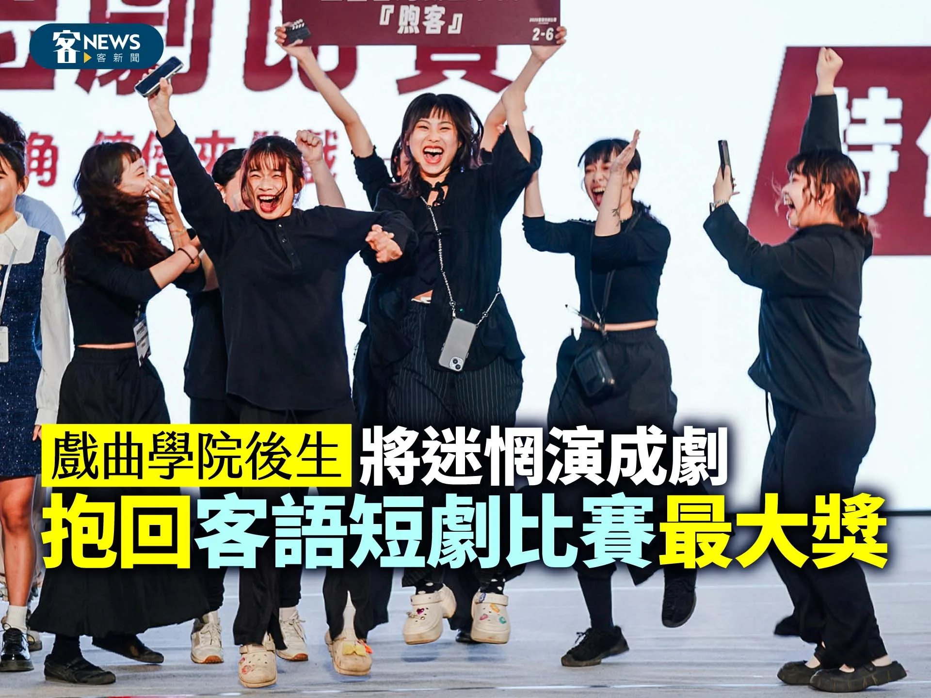 國立台灣戲曲學院學生在獲獎當下激動地在台上跳起來。客家委員會提供