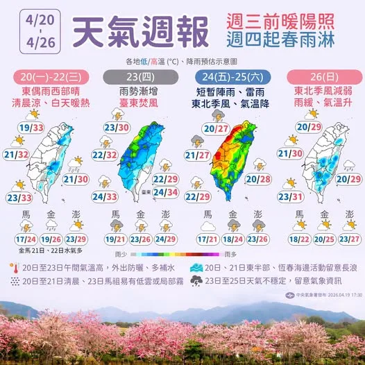 吳德榮表示,22日至23日上午水氣略增,各地仍晴時多雲、白天偏熱,山區午後偶有局部短暫雨。23日下午起鋒面接近,中部以北轉有局部陣雨或雷雨;24日鋒面南下、由北而南轉有局部陣雨或雷雨;25日鋒面影響,降雨範圍擴大,各地區有局部陣雨或雷雨,期間應慎防雷擊、強風、瞬間強降雨。24、25日氣溫下降,北台灣轉涼。(中央社)